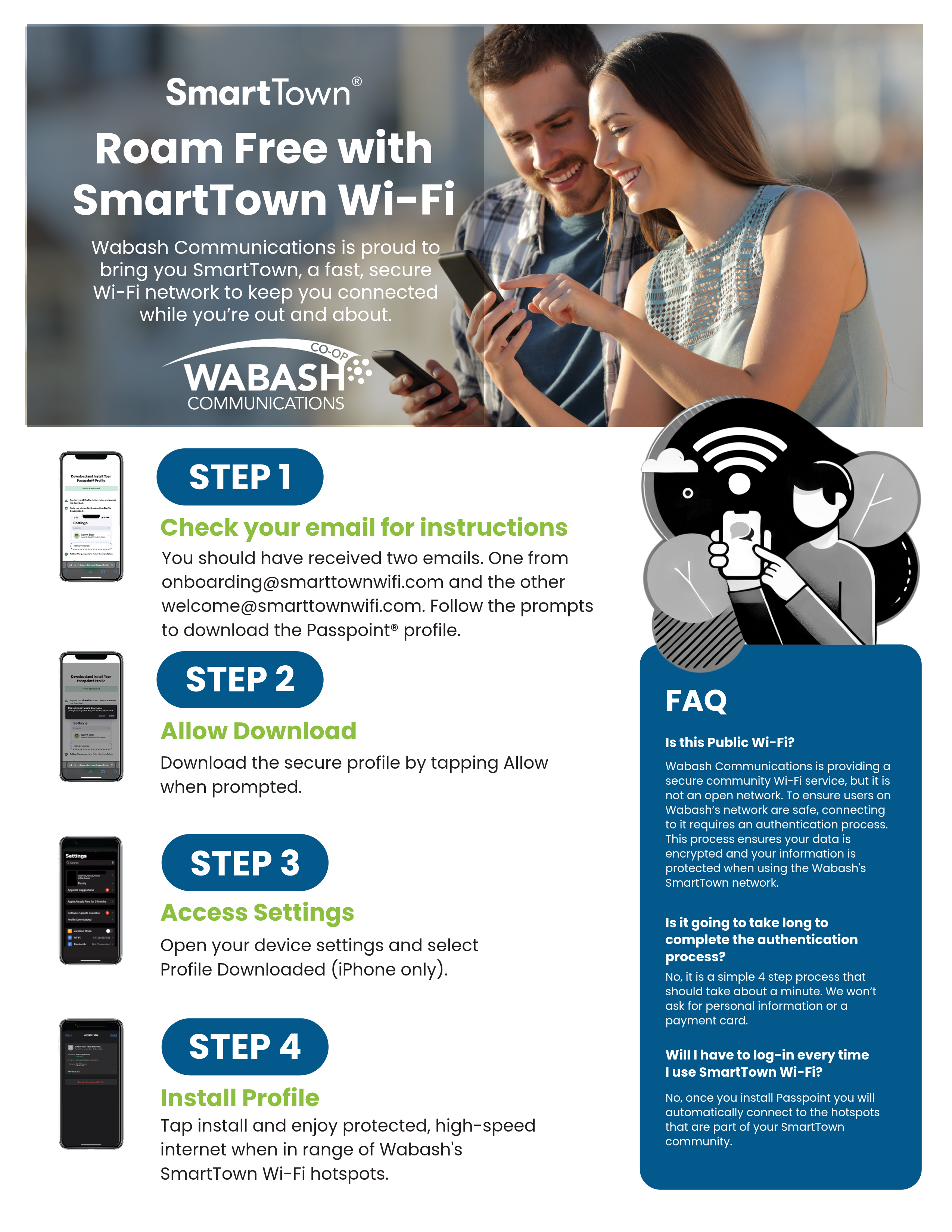 Wabash is providing a secure community Wi-Fi service, but it is not an open network. SmartTowns network is only available for Wabash Communications customers to securely connect to. To ensure users on Wabash’s network are safe, connecting to it requires an authentication process. This process ensures your data is encrypted and your information is protected when using the Wabash’s SmartTown network.